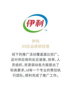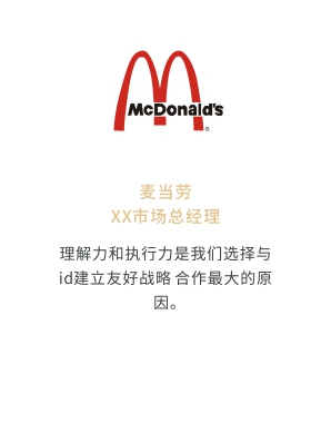 i-d先后經(jīng)歷與Audi、Mercedes-Benz、infiniti、PORSCHE、可口可樂、麥當勞、肯德基、Budweiser、華為、小米、中國移動、ELLE、L'OREAL、萬達、仁恒置地、恒大、碧桂園、蘭桂坊...的業(yè)務合作,成功地將國際化的營銷策劃理念及執(zhí)行方式融入本土,為更多的中國企業(yè)開啟全新的品牌推廣思路和執(zhí)行方案。
